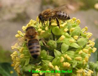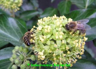 Efeu blüht in den Monaten September bis Oktober und stellt auch damit eine Besonderheit innerhalb der mitteleuropäischen Flora dar, deren Blütezeit zum größten Teil in den Frühjahrs- und Sommermonaten liegen. Aufgrund dieser späten Blüte ist der Efeu eine wichtige Nahrungsquelle für Bienen, Wespen und Schwebfliegen. Die unscheinbar kleinen gelbgrünen Blüten stehen in halbkugeligen Dolden und erscheinen nur an älteren Pflanzen.